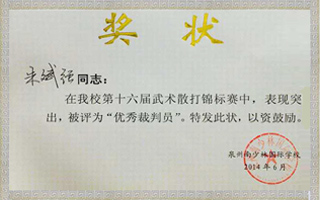 获得南少林国际学校“优秀裁判员”